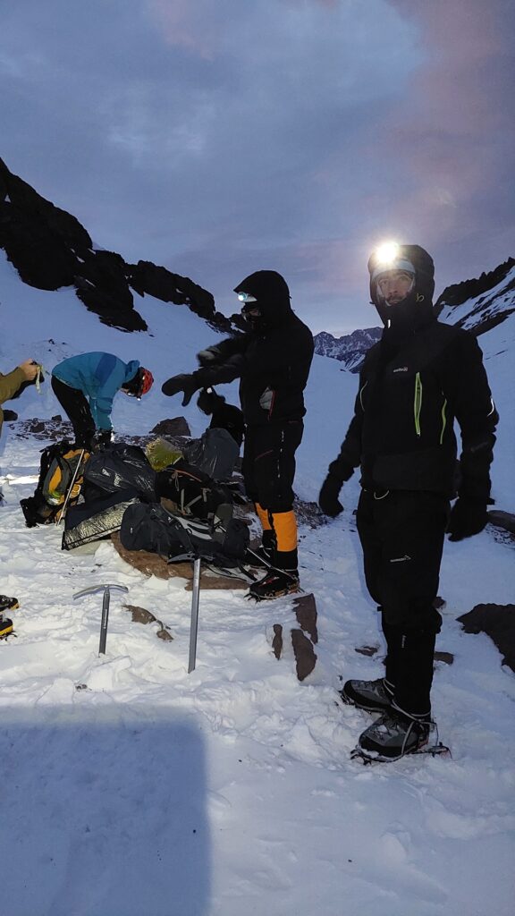 Pasamos una buena noche, y muy temprano, después del desayuno salimos para la cumbre. La nieve un poco mas dura por la baja temperatura y con linternas encendidas íbamos paso a paso ganando altura. Aquí utilizamos las técnicas desarrolladas en el taller de grampones y piolets.